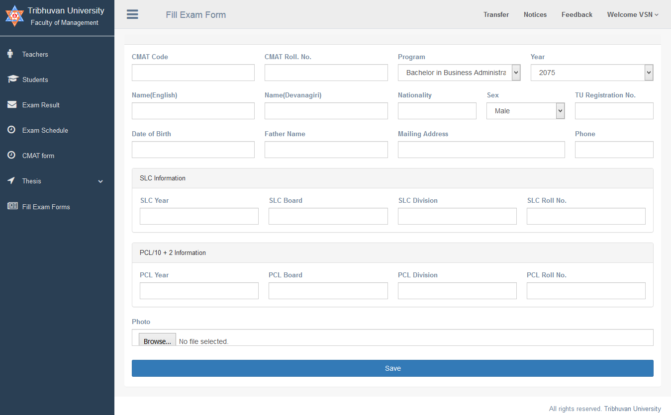 Fill the corresponding fields in the form. The faculties with yearly exam system do not need to fill CMAT code(N/A) and roll no(N/A).